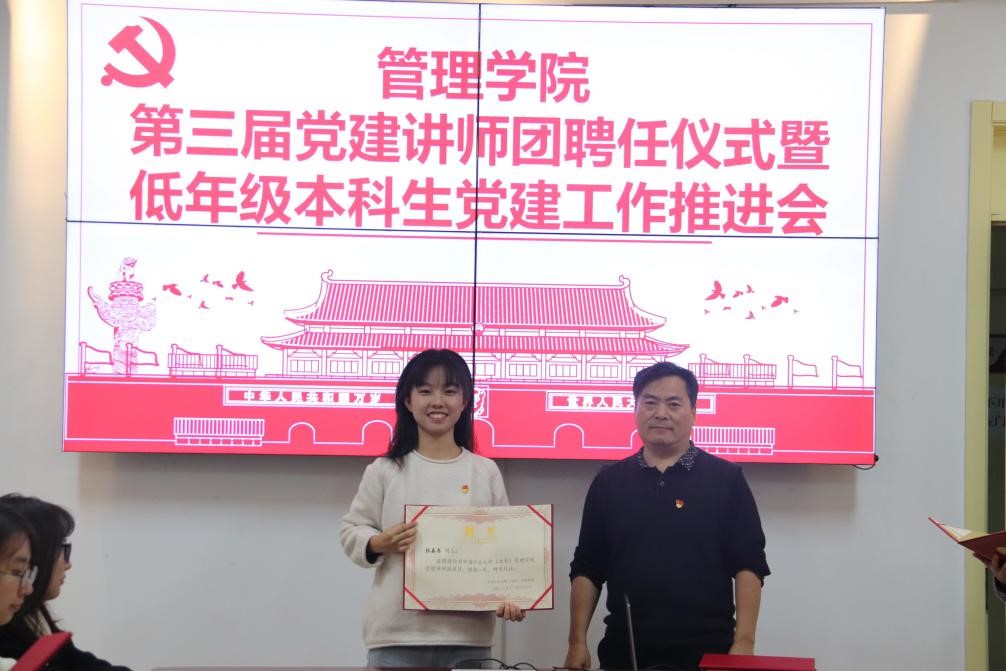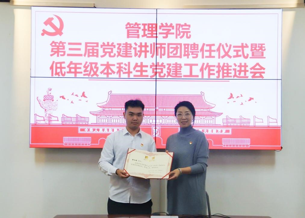 高洁为第三届低年级党建讲师团团长黄文超颁发聘书