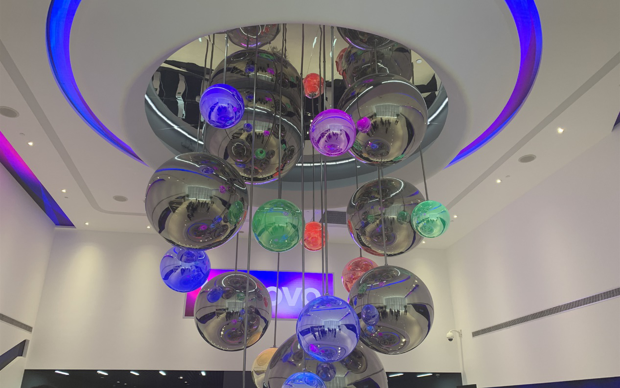 走进联想未来中心,满满的未来感和科技感扑面而来。本次“智能之旅”的“起点”,便是那入口处悬挂的一颗颗不同大小、五颜六色的球。据工作人员介绍,只要录入人脸信息并输入喜欢的颜色,一旦展示大厅的感应器捕捉到你的面部信息,球就会相应的变成你喜欢的颜色。