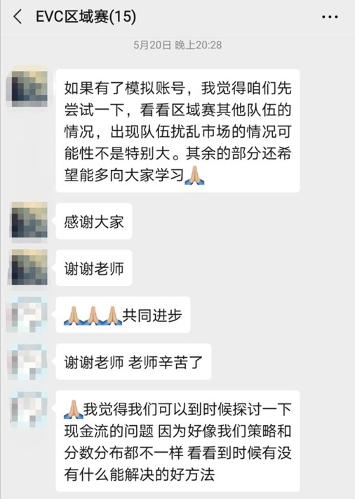 2020年6月14日上午8:30,EVC实战比拼正式开始。华北区共计150支队伍参赛,市场竞争异常激烈,且经营环境发生了较大变化,市场在第三期开始急剧萧条,同学们的经营与扩张计划都被打乱,必须及时调整价格、渠道与材料采购等策略,面对未知的市场环境与激烈的竞争,三支队伍都顶住了压力,取得了不错的成绩。