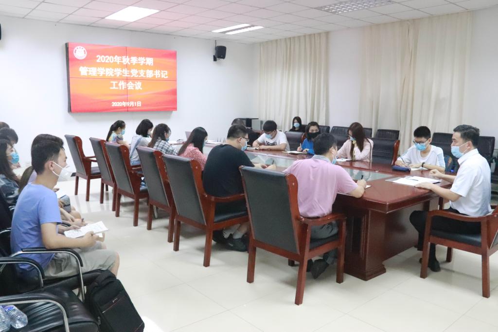 2020年9月1日下午,在理化楼103召开了管理学院2020年秋季学期学生党支部书记工作会议,管理学院党委书记杨庆舟、党委专职组织员崔艳娜、辅导员丛琳以及20名学生党支部书记、委员参加了会议,会议由党委副书记李邦三主持。