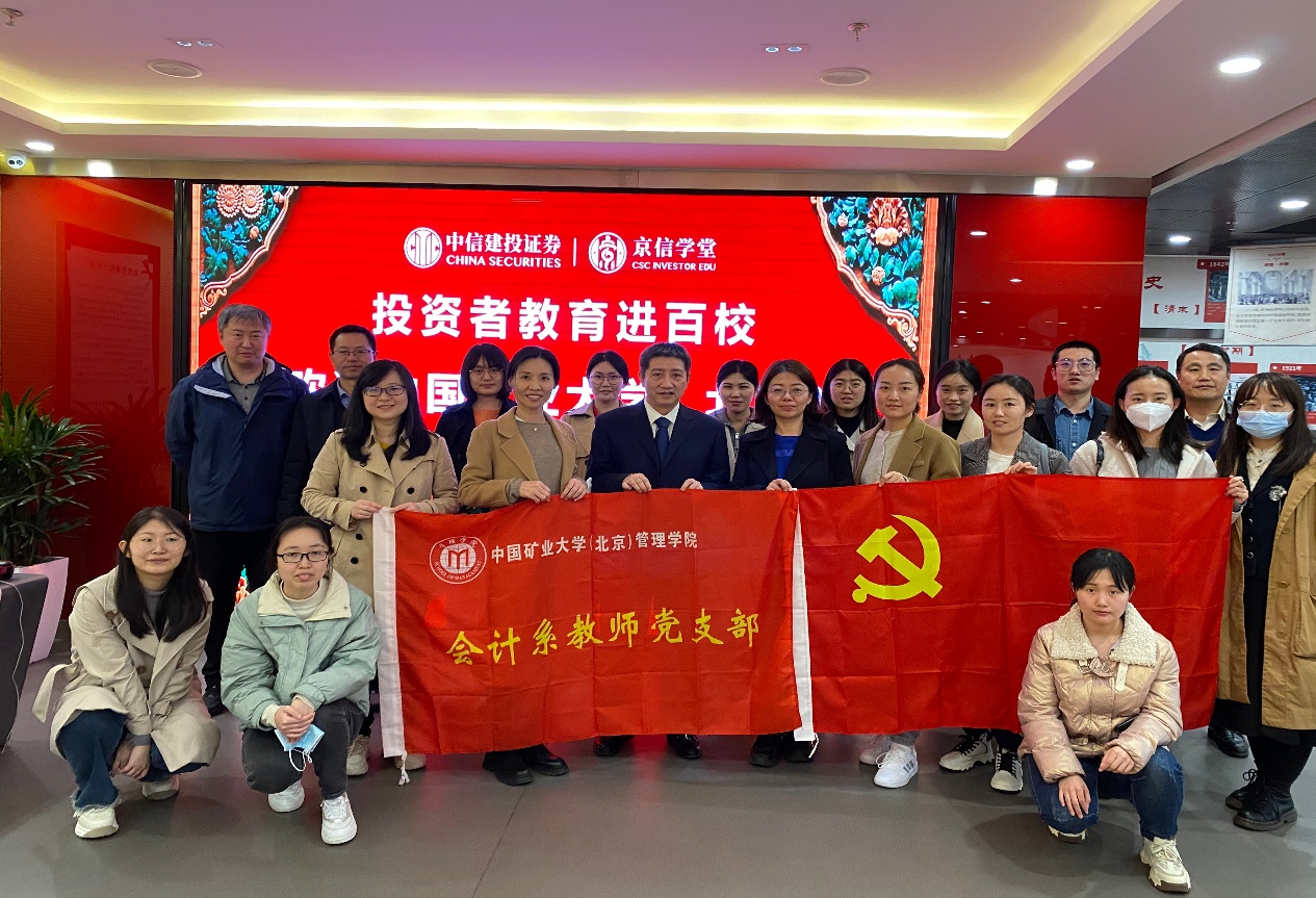 为更好地促进理论学习和实践活动相结合,增强对证券领域的认识和理解。2023年4月4日下午,管理学院会计系教工党支部联合管理学院学硕20-3党支部和专硕20-1党支部共计20余人前往中信建投证券投资教育基地开展了支部联合共建活动。