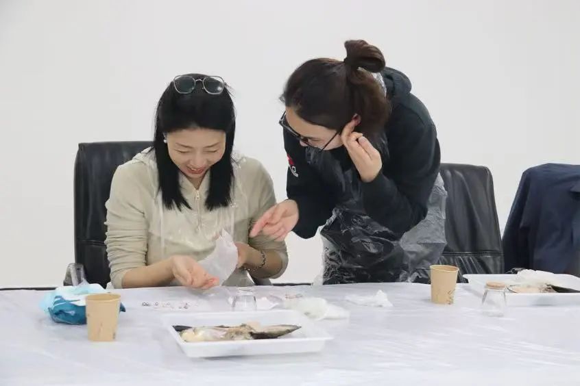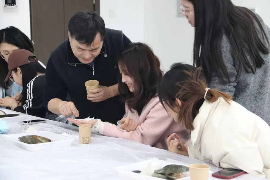 DIY手作活动现场,专业指导老师向女教师们详细介绍了珍珠的形成过程、开蚌技巧及相关注意事项。随后,女教师们满怀期待与欣喜,亲手开启属于自己的珍珠蚌。经过开蚌、取珠、浸洗等一系列流程,一颗颗圆润晶莹、颜色各异的珍珠呈现在大家面前。